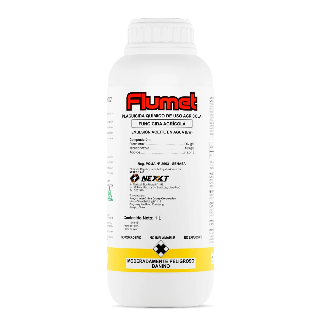 FLUMET con sus dos ingredientes activos: Prochloraz y Tebuconazole, tiene acción prolongada,preventiva, curativa, y antiesporulante. Prochloraz es un fungicida con acción de contacto y translaminar que protege la superficie y la capa superior de las hojas. El Tebuconazole tiene acción sistémica e inhibe la síntesis de ergosterol de los hongos, y al traslocarse de forma acropétala (hacía arriba) en las plantas, protege los nuevos brotes.